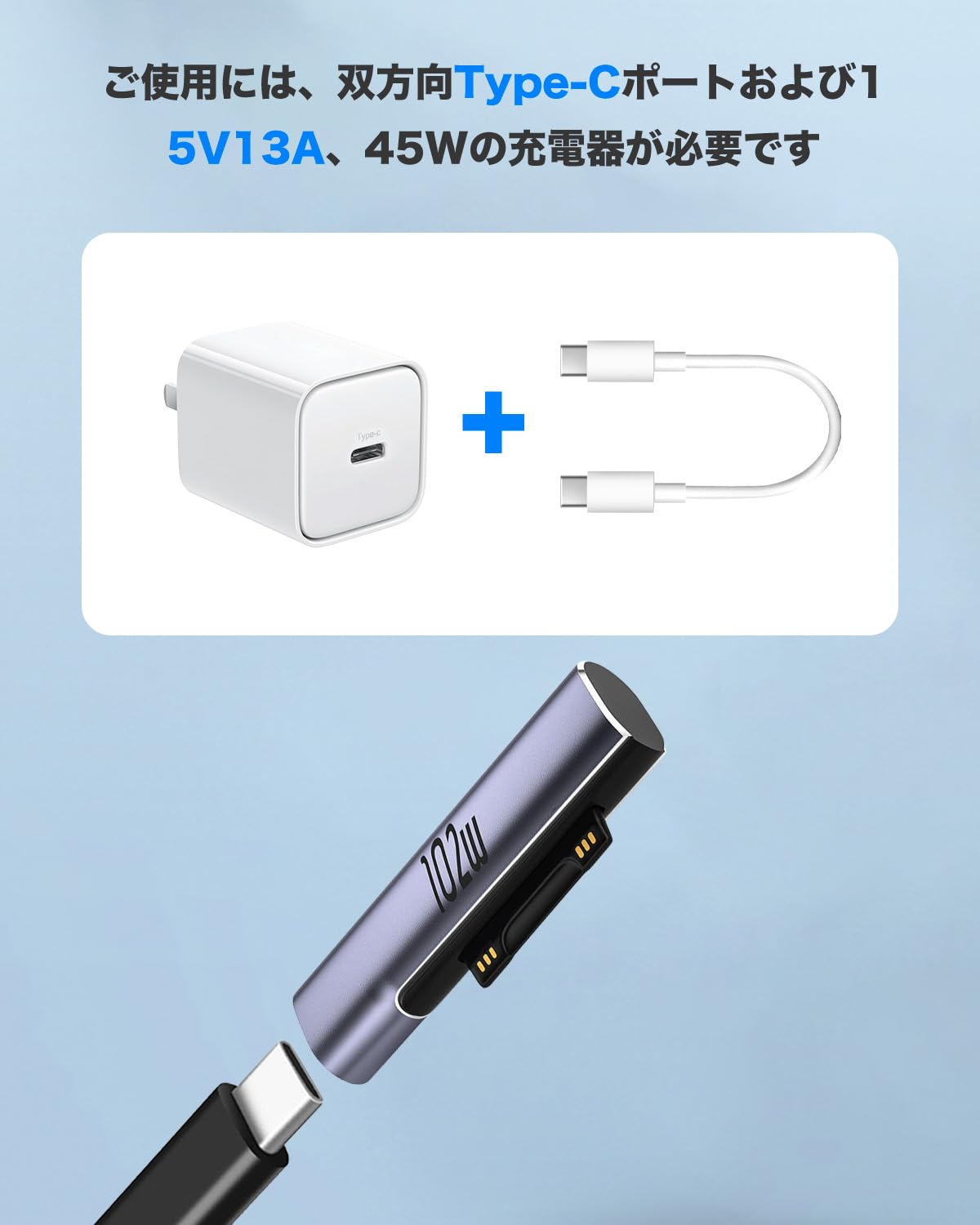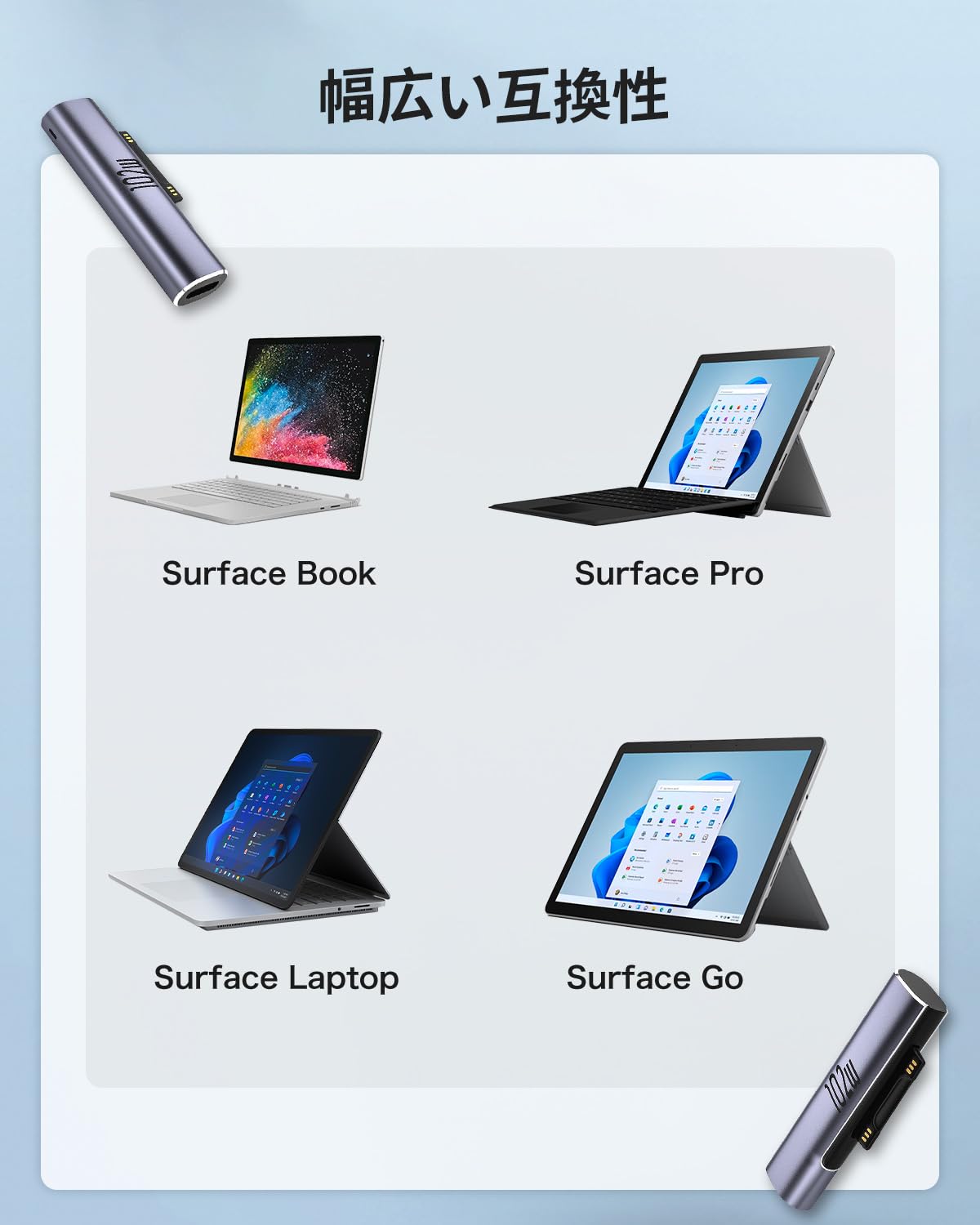 【適用機種】Surface Pro7/Pro6/Pro5/Pro4/Por3/Laptop3/2/1/Book2/Book1/Go 対応 ご注意:PD(Power Delivery)出力が必要であり、USB-CポートはPD電源のみを接続するか、双方向のUSB-Cケーブルを直接PD電源に接続する必要があります。45W未満の電源やモバイル電源には対応していません