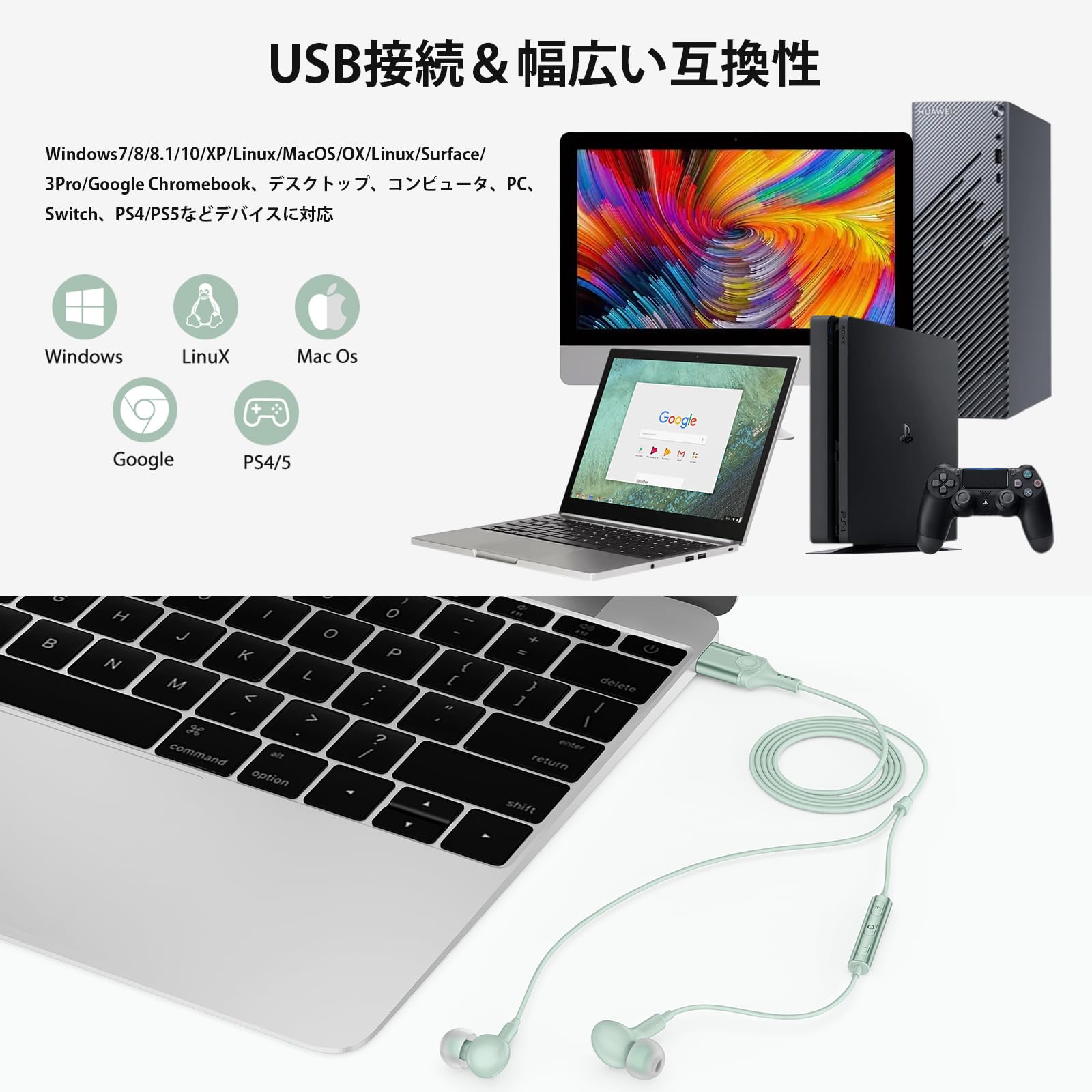 USB接続で挿すだけで使える:パソコン、PC専用のUSBイヤホンです。USBポートに接続するので、充電とドライバのセットアップ等は不要でパソコンのUSBポートに挿すだけですぐに使え、マイク端子のないパソコンでも使用できます。例えばデスクトップパソコン、ノートパソコン、デスクトップ、スイッチなど。多くのシステムに適用。対応 Windows 7 8 8.1 10 11 12 XP 対応Linux、対応Surface Pro、対応Google Chromebook、対応Raspberry Pi Ubuntu、Switch、などUSB(Type-A)ポートを搭載したの機種に対応しています。