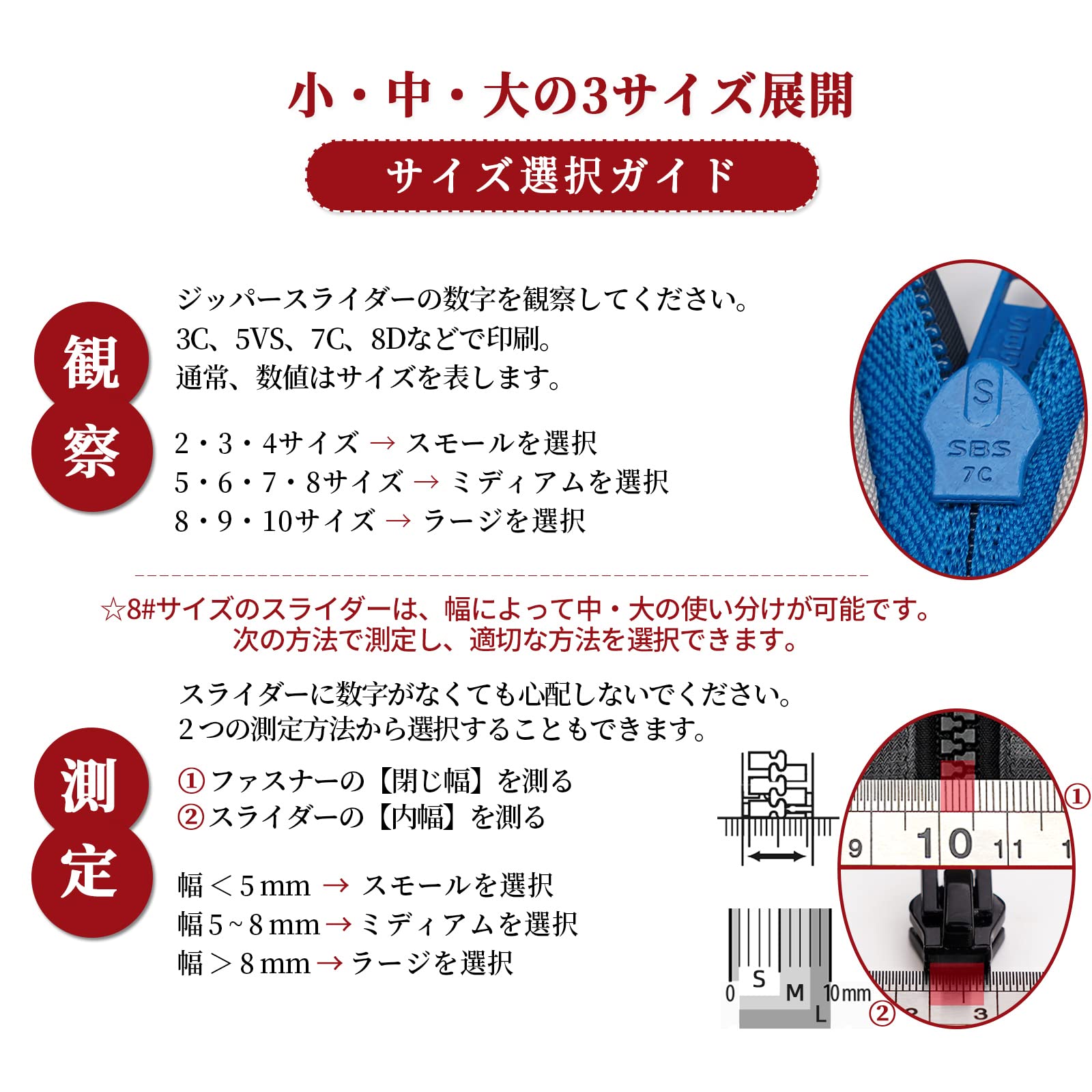 簡単に選択 - 最初にストランドヘッドの番号(1-10)をチェックして、当社の製品モデルに合わせたり、ジッパーの歯の幅を測定したりします。