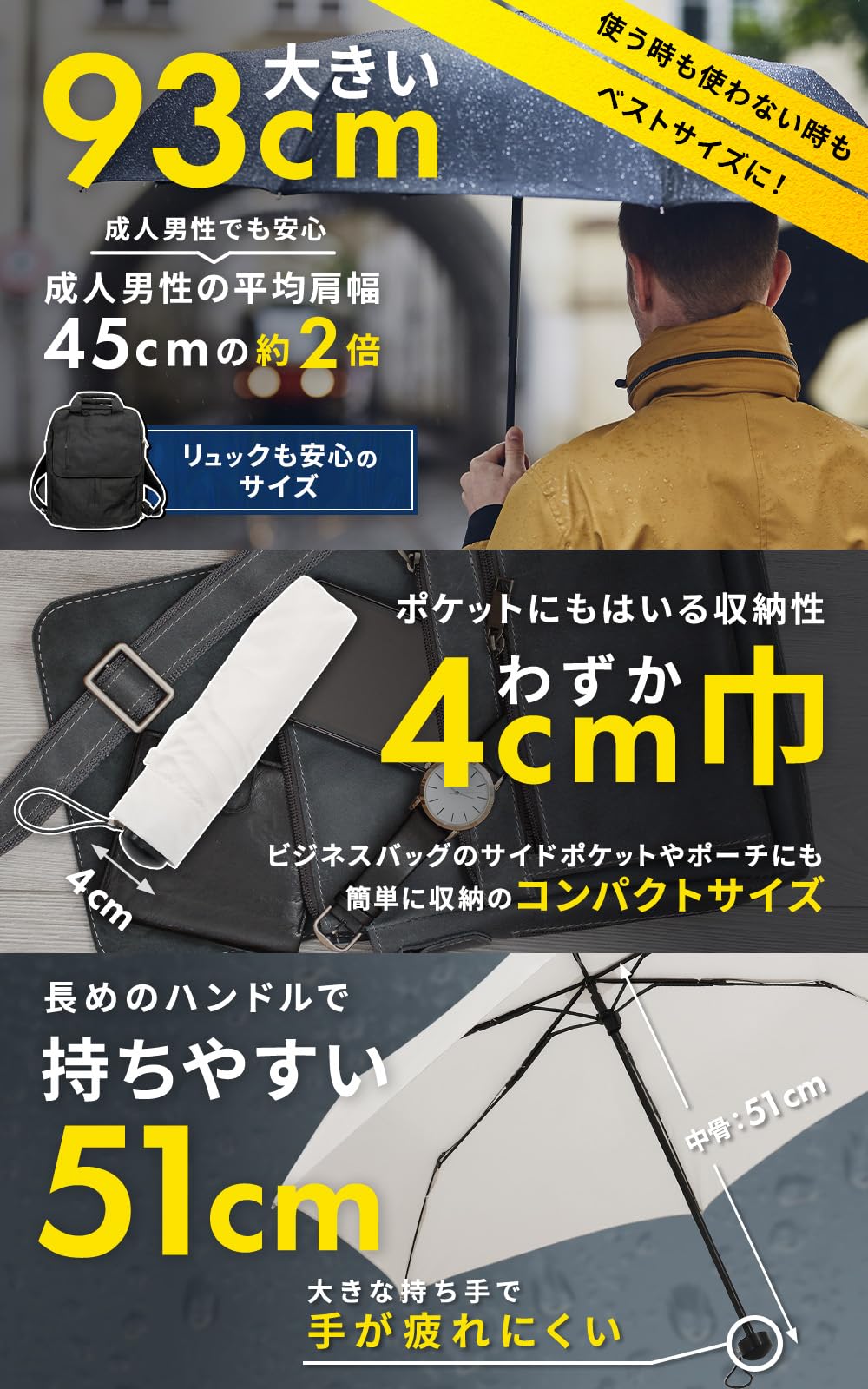 【使う時も使わない時もベストで】弧長100cmでリュックも安心のサイズ!長めのハンドルで持ちやすく、大きな持ち手で手も疲れにくい設計になっております。使わない時は、わずか巾4cmでビジネスバッグのサイドポケットやポーチにも簡単に収納のコンパクトサイズ