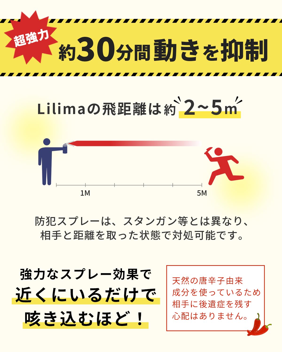 ✨【安全設計】誤噴射を防ぐキャップ付き&天然の唐辛子由来の成分を使用。安全面にも配慮していますが、直接浴びなくても近くにいるだけで咳き込むほど効果は強力な防犯スプレーです。