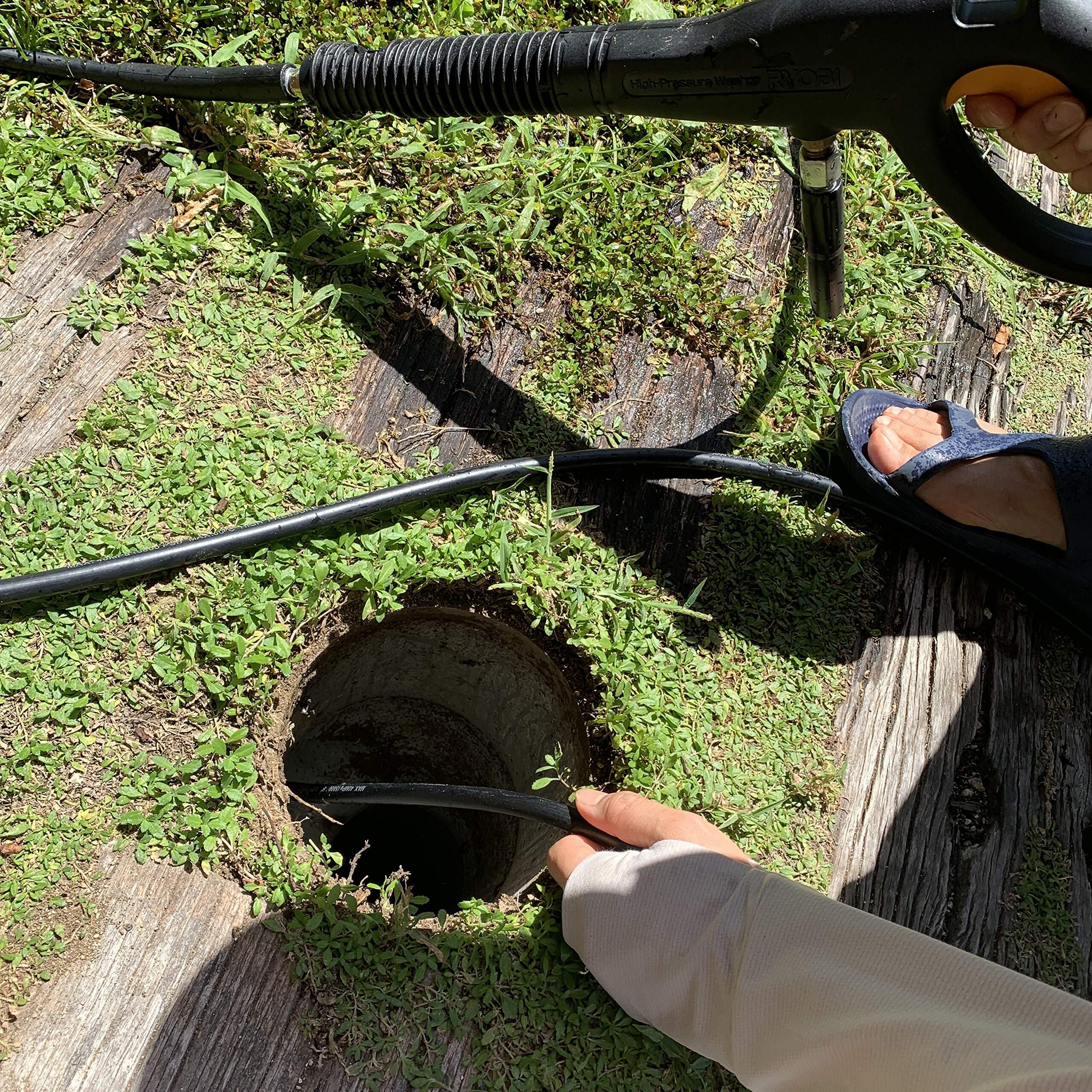 先端のノズル前方1箇所、後方3箇所から高圧水が逆噴射し、配管に沿って進み詰まりを解消します。