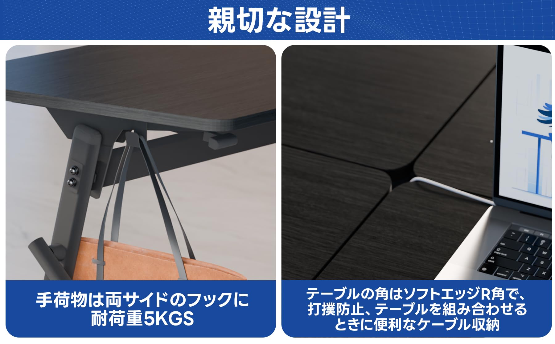 【親切設計】人型テーブルの脚は滑らかな弧を採用し、使用時にぶつかって怪我をしにくく、耐荷重5kgまで荷物を掛けられます、また会議テーブルの両側には2つの収納フックが付いており、傘やかばんなどをかけることができる。