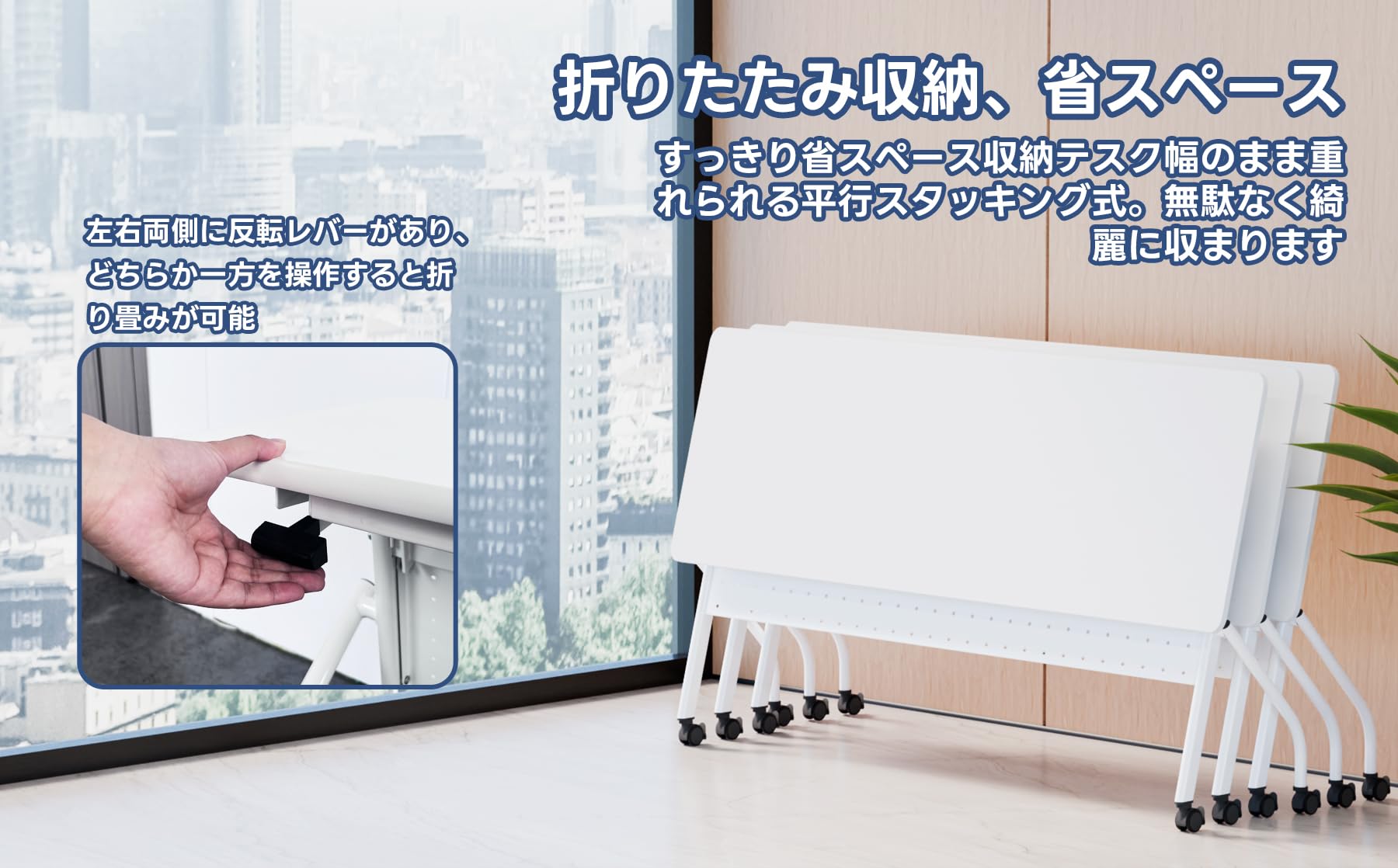 【会議テーブルを素早く収納】折りたたみ式の会議テーブルは収納に便利で、収納スペースを節約できます。片手で折りたためて重ねて収納できるキャスター付き会議テーブル,使用しないときに簡単に保存できます。