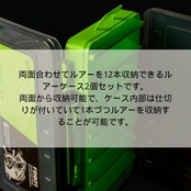 両面合わせてルアーを12本収納できるルアーケース2個セットです。両面から収納可能で、ケース内部は仕切りが付いていて1本づつルアーを収納することが可能です。