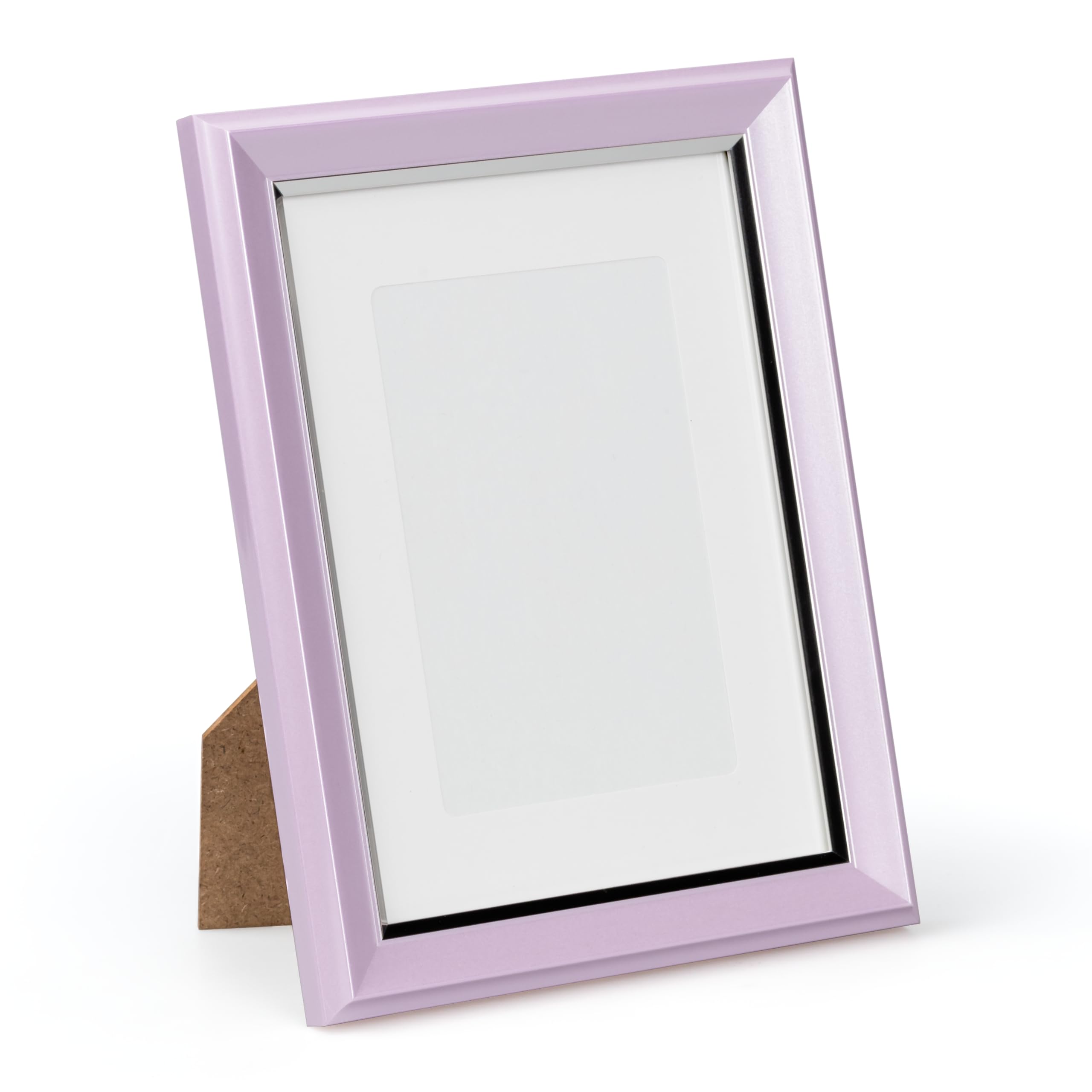 【製品仕様】額装サイズ:2L、KG兼用 (128×178mm、100×148mm) / 額縁外寸法:162×212mm / 台紙外寸法:129×179mm / 台紙窓抜き寸法:80×125mm / 重さ:270g / 表面材:ガラス / 自立スタンド付、台紙:0.3mmウスマット