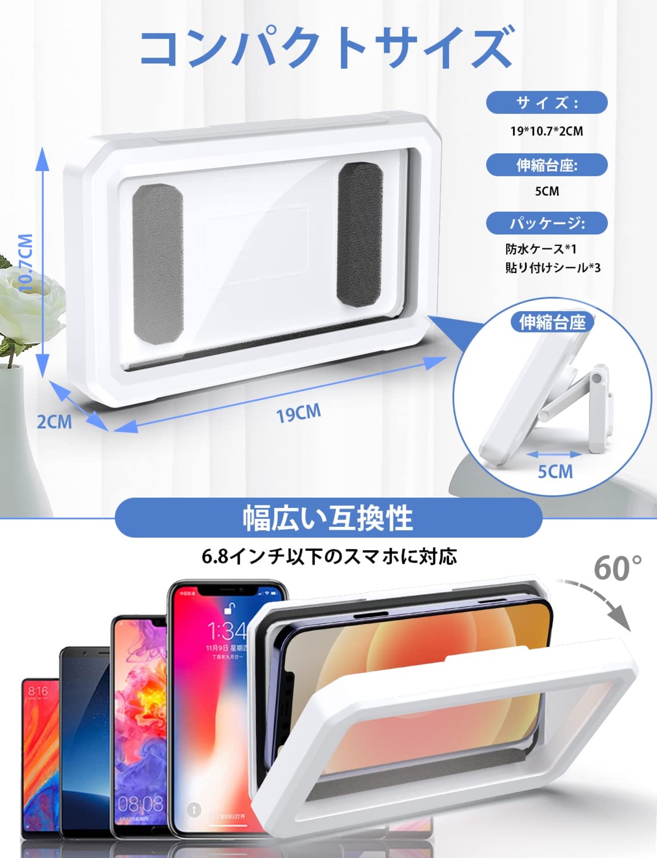 【アップグレード版&貼り付けシール3枚付き&伸縮式】Trywon スマホ 防水ケース iPhone 壁掛け スマホスタンド タッチ快適 Face ID認証対応 強力粘着 携帯電話ボックス 高性能カバー 伸縮式 高さ調整可能 360°調整可能 防水防塵 PVC超耐用材料 気泡/転落防止 6.8インチ以下対応 お風呂/キッチン/ラック/浴室/洗面所/トイレ用 白い