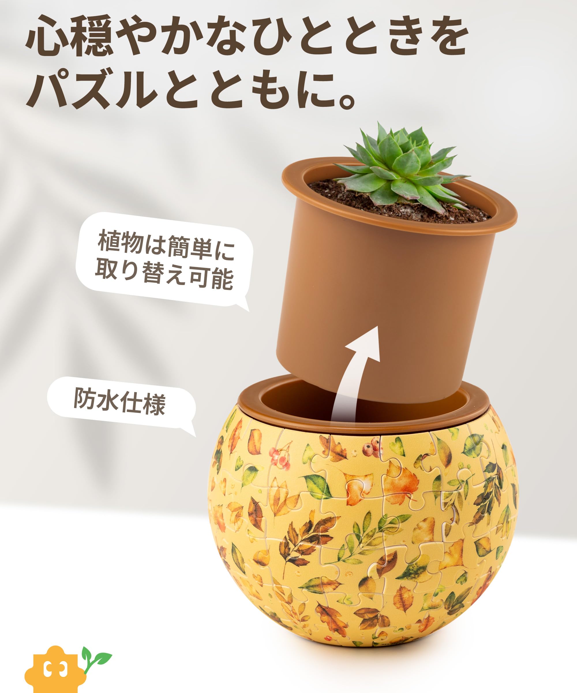 【ユニークな3Dジグソーパズル】80枚のカーブしているピースで組み立てられるプランターパズルです。プランターの中に、二重構造で余分な水分は排水穴のあるカップから排水穴のないカップへ流れます。植物はより健康で美しい状態を保つことが可能です。プラ製でできているため、倒したり、落としたりしてもプランターが割れる心配がありません。パズルの完成サイズ:口径10cm、幅10cm、高さ7.3cm。