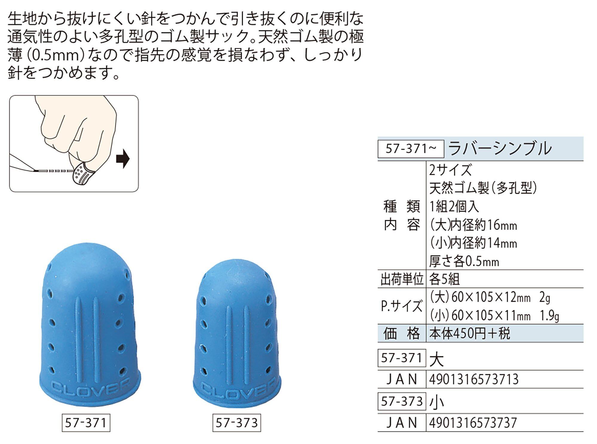 布から抜け難い針つかんで引き抜くのに便利な通気性のよい多孔型のゴム性サック。天然ゴム製の極薄(0.5mm)で、指先の感覚を損なわずに、針をつかめる。(より)