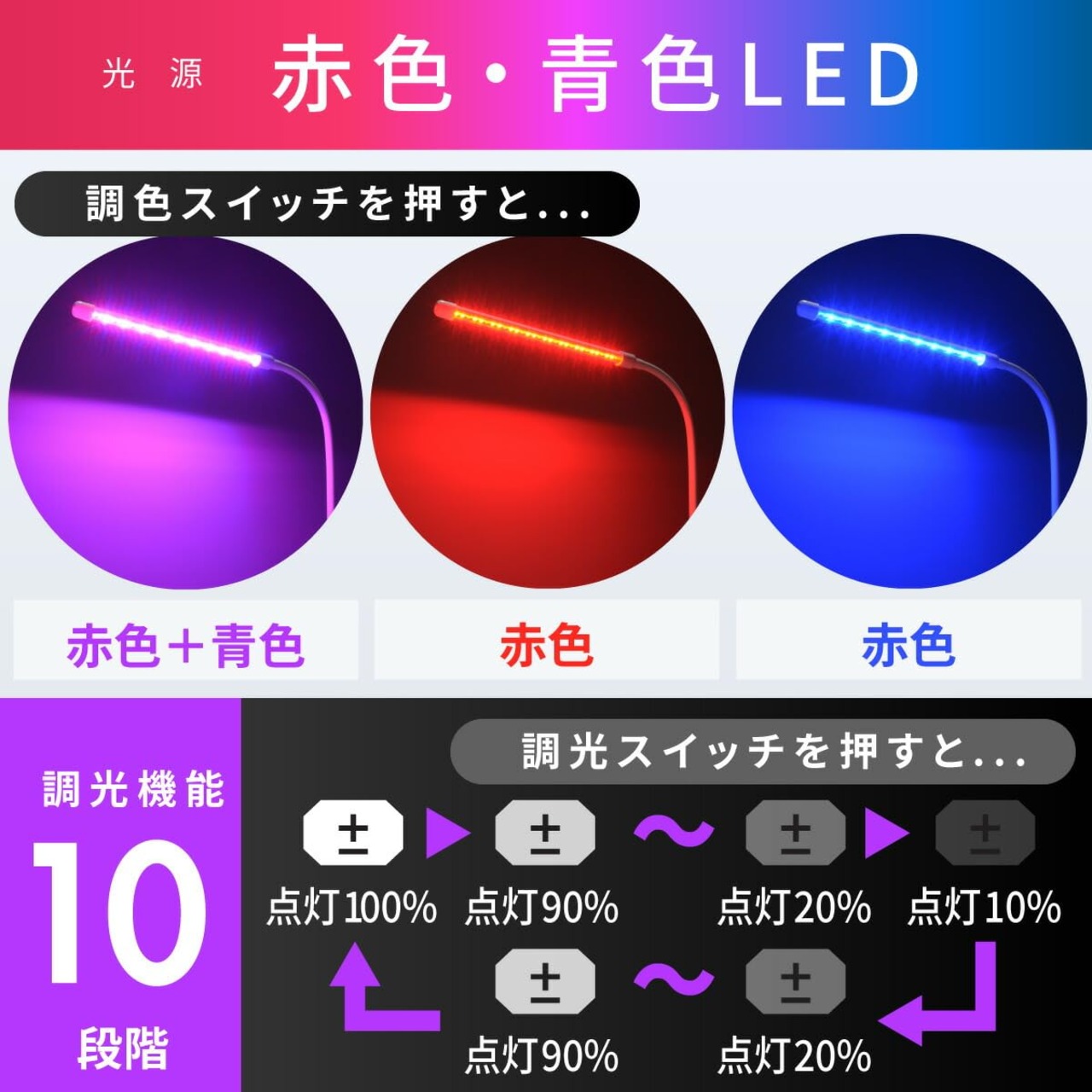 【 特 長 】 ◆室内で太陽光の補完をしてくれる植物育成ライト ◆「赤色+青色」「赤色」「青色」の調色機能付き ◆10段階調光機能付き ◆3段階タイマー機能付き(3/9/12時間) ◆フレキシブルアームでセード調整が自由自在 ◆USB電源式 ※USBアダプター別売