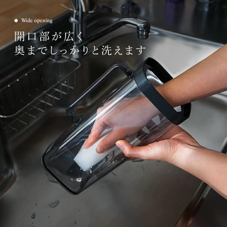 ワンプッシュオープン方式で手軽に注げる。冷蔵庫で横置きしても水漏れしない。スタイリッシュで、卓上にも映えるスクエア冷水筒。