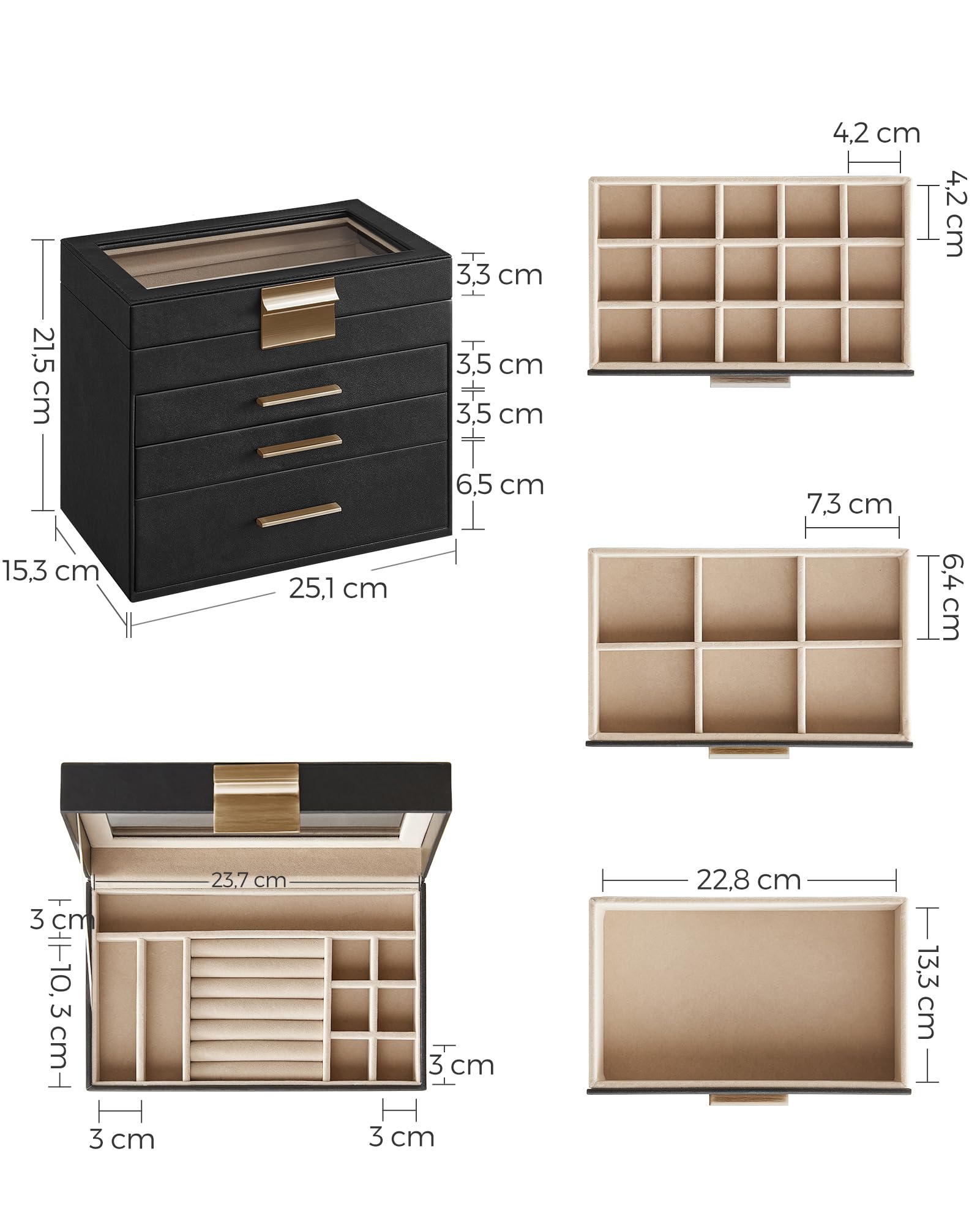 SONGMICS ジュエリーボックス 大容量 アクセサリーケース 4段式 引き出し 指輪、ブレスレット収納宝石箱 ガラス蓋 母の日ギフト ブラック JBC161B02